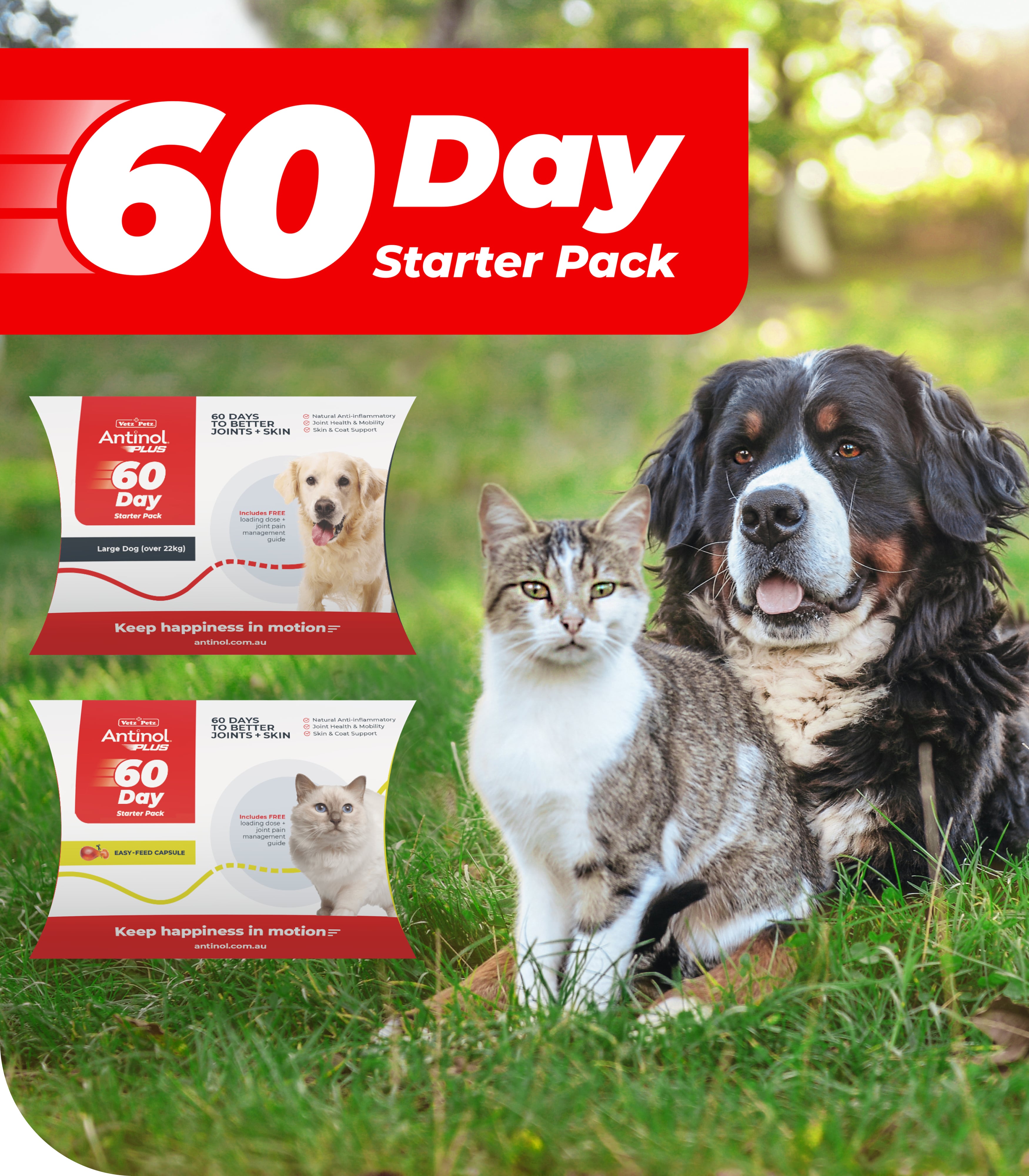 Today could be the first day of your pet’s joint + skin + coat transformation. Get started on the right paw with our Starter Packs below that are designed to help you see optimal results in the shortest possible time:
